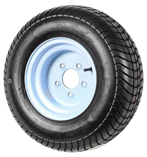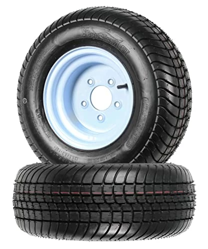 Pre-Mounted Trailer Tires & Wheels. 2-Pack Trailer Tires & Rims Bias Ply 20.5-8.0-10 Load C 5-4.5 White Conventional. Tire Size: 20.5-8.0-10. Aspect Ratio: 10. Section Width: 20.5. Load Range: C. Tire Weight Rating: 1100 Lbs.. Maximum Pressure: 50 PSI. Tire Composition: 6 Ply. Tread Depth: 7.8/32″. Sidewall Description: BSW. Speed Index: M. Load Index: 84/M. Internal Tire Type: Tubeless. Rim Size: 10″ X 6″. Bolt Configuration: 5 Lug 4.5″ Center. Offset: 0″. Center Bore: 2.83″. Rim Construction: Steel. Rim Style: Conventional. Rim Color: White. Lug Value Hole: 0.45″. Hub Stud Size/Nut Requirement: 1/2″-20 60 Degree Cone Nut. Torque Specifications: 50-75 Ft/Lbs.. Warranty: Two Years. Pack Quantity – 2-Pack