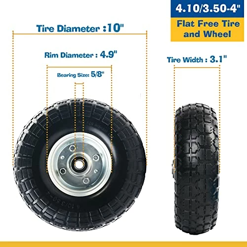 - Size: 4.10/3.50-4″ flat free tire and wheel
