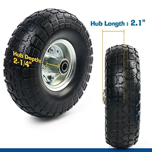 - The 4.10/3.50-4″ tires are made of heavy-duty rubber, the solid and durable construction ensures that the tires are puncture, tear, wear, and rot-resistant. The rims are steel with solid metal hubs that resist impact cracks and suitable for all-terrain use