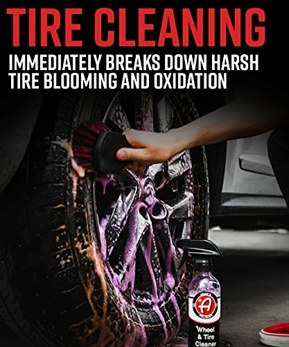 - ✅ GET RID OF BROWN TIRES – If you’re happy with brown, old and decrepit tires, look away! If you’re wanting to thoroughly clean your vehicle’s shoes and make them look like new again, then look no further! Adam’s Wheel & Tire Cleaner contains a blend of alkaline-concentrated solvents and surfactants to create a high sudsing formula and removes silicones, greases, wax build-up, polymers, and any previously applied dressings to leave your tires and wheels looking new.