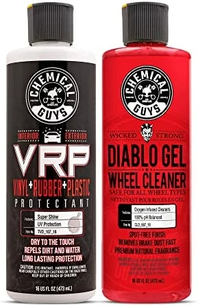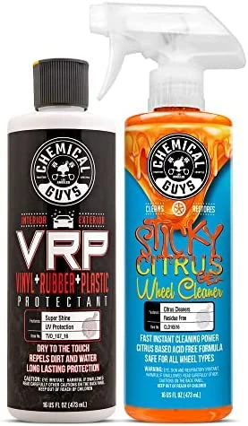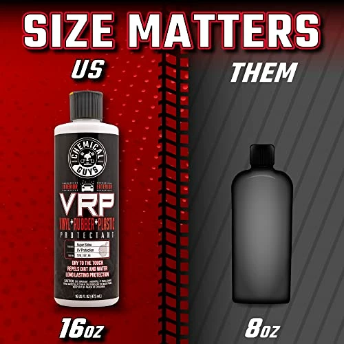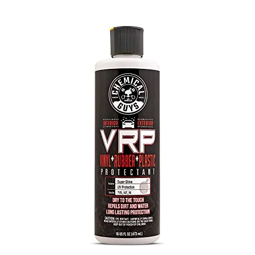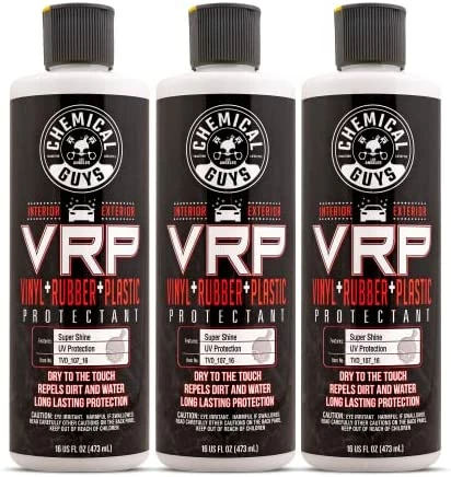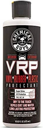 VRP Protectant is the ultimate protection and shine enhancer for interior and exterior trim. VRP creates a super shine finish on any rubber, vinyl, or textured plastic surface. The easy-to-use protectant restores a deep black look, enhances shine, and protects the surface against solar rays. Perfect for tires, bumpers, trim pieces, bumper moldings, side mirrors, and much more. Easily protects dashboards, door panels, vinyl seats, and steering wheels. VRP provides a brilliant shine and restores the dark black appearance to plastic and rubber trim. Apply to rubber tires to maintain the dark black finish after every wash. Restore mirror and bumper trim from dull and faded to dark and rich. VRP Protectant leaves no-residue and finishes dry-to-the-touch. VRP Protectant keeps your trim looking like new for weeks, not days. VRP penetrates deep into the pores of plastic, rubber, and vinyl to restore and protect the surface to factory-new condition. The water-based protectant creates the perfect new appearance on interior and exterior surfaces, not a greasy wet look. Restore the dark, rich shine to vinyl, rubber, and plastic trim with Chemical Guys VRP Protectant.