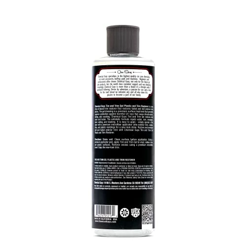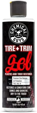 While this is marketed as ‘Tire & Trim’ and does work well on tires, my interest was trim. I have a couple of older cars (a 2001 Volvo and a 2002 Durango). The paint is immaculate and they are well kept. Over the years from exposure to sun ran, salt, etc. the plastic trim pieces like body mouldings, have faded and grayed significantly. On the Volvo these trim pieces are dark gray when new, while on the Durango they are black.I was using Dub Tire spray on them, as this tends to darken them and lasts at least a few weeks before fading. The Dub product si a spray though, which means carefully spraying larger areas, or spraying onto a rag for narrower spots. Dub is also not cheap, and I use it on my tires so I am always running out.The other approach, which you should NOT do unless you know what you are doing, is to use a heat gun on a low setting to “wet” the surfaces. Essentially, you are melting their surface, but not visible to the naked eye. While this works very well, it is not something you want to do repeatedly as it weakens the plastic. I have done this on both cars once though, and then treated them with Dub. The results were remarkable.OK so…..Chemical Guys Tire & Trim Gel……FANTASTIC. It comes as a gel, liquidy enough to pour onto a rag, but thick enough not to run all over the place. I used very little to wipe it onto the plastic on the two cars. It works great. It darkens the plastic just as well as the Dub product, and it adds a little shine as well. Because it is a gel it is a bit easier to apply by hand in tight spots, around lights, etc.This product is excellent on tires and I like that I don’t have to worry about overspray on the car or wheels, like with Dub. But the tires were not my goal – it was faded trim.This product is not going to mask severely milky plastic. If it’s faded to a gray and has some whitenes to it, it works, but it has a lot of white in it, not so much. That’s where the heat gun treatment can sometimes help. Again, that is NOT for everyone.I have included photos of the Volvo, with its plastic and and tires treated with this product. I had already done the car about 3 months ago with Dub, so I can’t show you the total “before”. However in the second photo, you can see the spot I intentionally had skipped to test Dub, and now the Tire & Trim gel. You can see how light the bottom piece is compared to the top. The top piece is also part of the bumper and was the most severely worn.The other photos are a roof rack on a 7 year old minivan. You can see from the before and after the huge difference.This product may not get the plastic back to showroom condition, but it will get you 90% or more of the way there.By the way, it also works on faded/milky metal trim like wiper arms, making them a glossy black. That tends to last only a week or two though.The real question becomes how long it lasts. I will update this review once I see how it looks in a week or two.