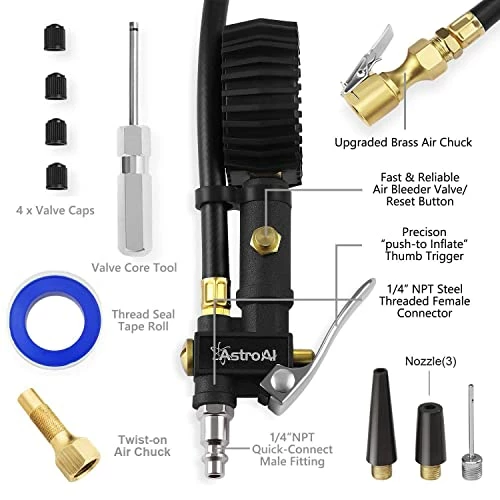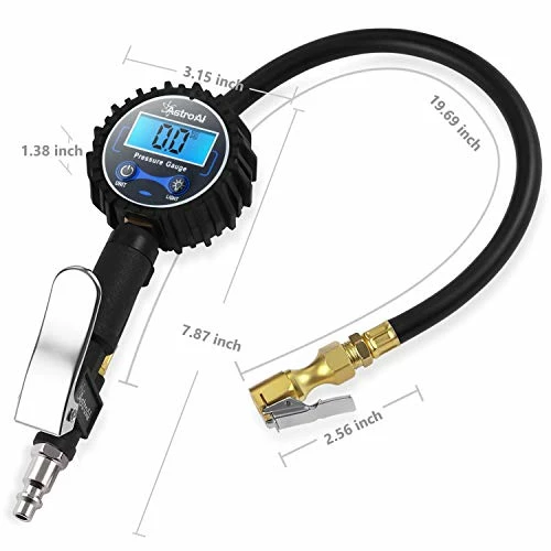 - ALL-IN-ONE FEATURES: The LED backlit screen features measurements in PSI, KPA, Bar, and Kg/cm^2; Includes an inflator, straight locking chuck, gauge, hose, bleed valve, all in one unit, ideal for cars, bicycles, motorcycles, balloons, air cushion, sports balls and so on; Compatible with ¼” NPT air compressors output