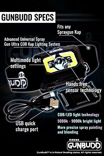 95% of our paint jobs are seen in daylight. To compensate for this, GunBudd projects a daylight beam (5000k – 9000k bright light) onto your paintwork through advanced COB/LED light technology. You have the option of choosing one or the other with the push of a button. The new touchless feature allows you to turn on and off your GunBudd with the swing of your hand! QUICK SPECS: – Up To 500 Bright Lumens! – So bright you’ll see everything! – 3.7 Volt Fast Charge Lithium-ion 1200 mAh Battery – A long-lasting battery that will never fail you. Included USB cable allows you to quickly charge your GunBudd on the go! – Uses Advanced COB/LED Light Technology! – It gives you an intense wide-range of light so you can see your paint lay on like never before. – USB Charge Cable Included – Allows you to quickly charge GunBudd in your car, wall outlet, computer, or battery pack charger on the go! – All On Run Time: 3:00:00 Hours. (normally lasts longer because the light is turned off when not spraying). It can be easily used through a complete paint job if turned off during paint flash times. Through our testing, when using a fully charged unit, we never had an issue with the battery life as long as you turned it off while not in use. GunBudd is a universal spray gun light system that will fit on any spray gun cup! It will help you shine a beaming light on all of your paint projects to make sure that you get the job done right. Say goodbye to poorly lit areas in your spray booth, or DIY garage… Just snap on Gunbudd, and spray away as the COB/LED bright light enhances your view like nothing you’ve ever seen! GunBudd allows for more precise spray painting and blending. You’ll have an easier time seeing what you’re painting, which will also make color blending and custom paint projects a breeze! What are you waiting for? Snap-on a GunBudd today and just see what you’ve been missing! GunBudd is in Patent Pending status and is a registered trademark. ALL RIGHTS RESERVED.