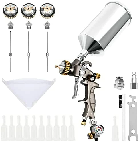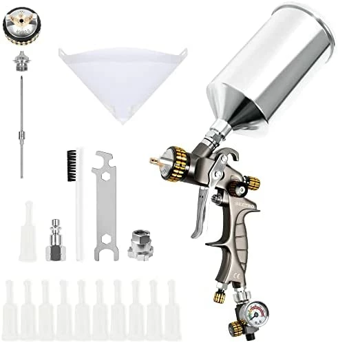 - Can be used with WATER-BASED PAINT. Includes: Air spray gun equipped with 1.4mm nozzle, 1 set of 1.3mm nozzle, 1 set of 1.8mm nozzle, 1000ml aluminum cup*1, Spanner*1, Handle brush*1, 1/4” connector*1, Type 2 adapter *1, Plastic filter*11, 190M Paint Strainer*10, Air control valve*1