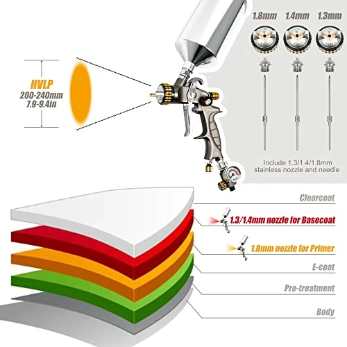 - Include 3 sets of stainless steel nozzle sets: The 1.3 mm and 1.4 mm nozzle sets are ideal for use with base coats, clear coats, single stage, primer-sealers, and other light to medium viscosity paint coating materials. The 1.8 mm nozzle set is ideal for primers, 2K primers, surfacers, and other medium to high viscosity paint coating materials