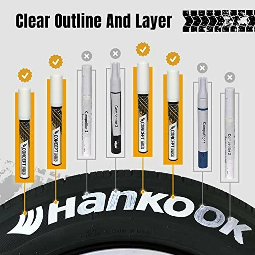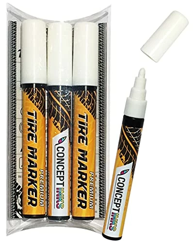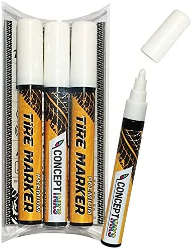 - PACKAGE CONTENT: 3 Concept Inks Premium Tire Marker Pens (WHITE). Made in Japan. Make the letters on your tires stand out. In general 1 marker will easily cover 2 coats on 4 tires on a medium size car. You will still have plenty left for touch ups later on